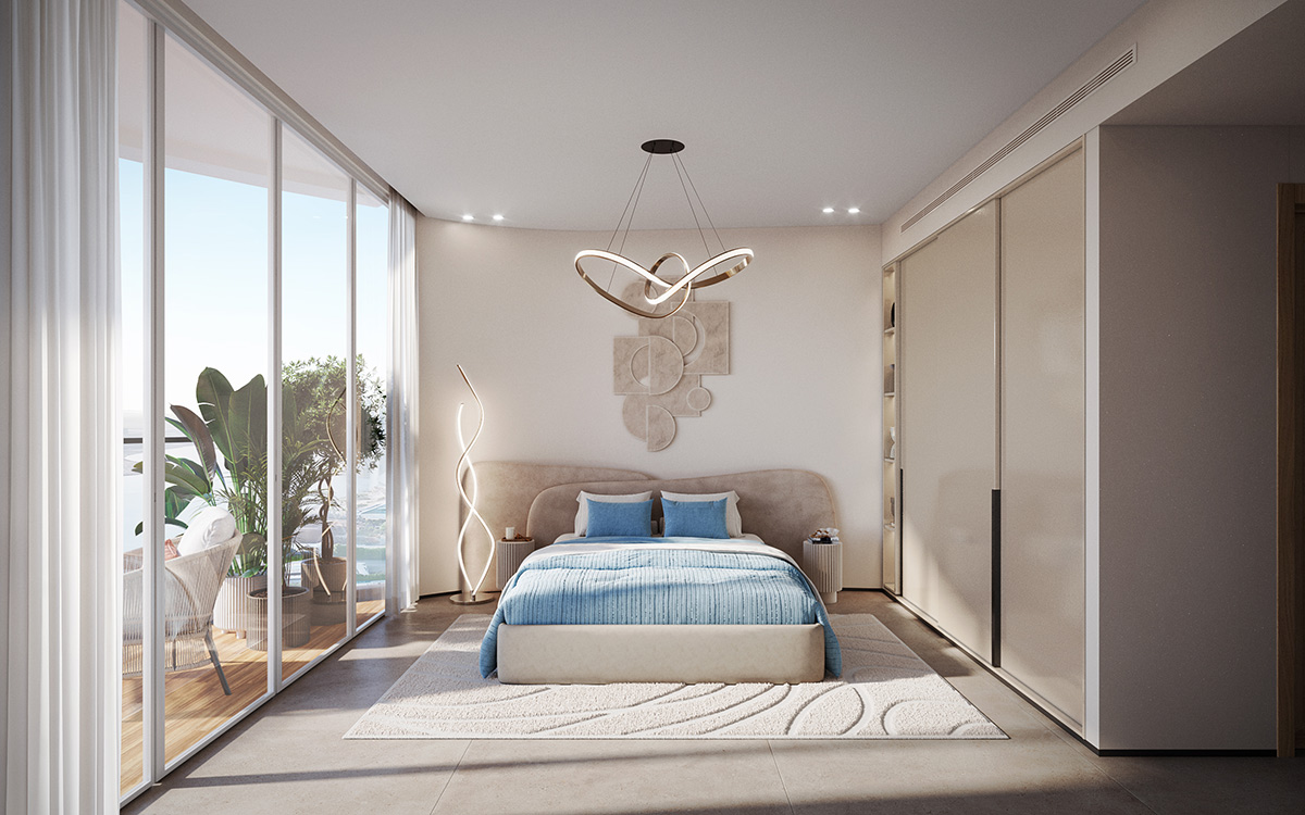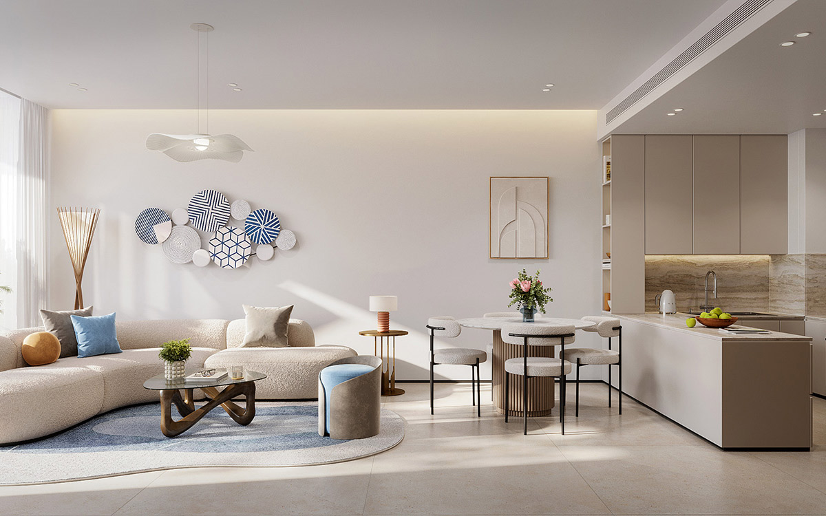 Expansive, open-plan layouts are flooded with natural light, accentuating the glassy finishes and aqua-hued touches that infuse each home with a subtle, refreshing elegance.
